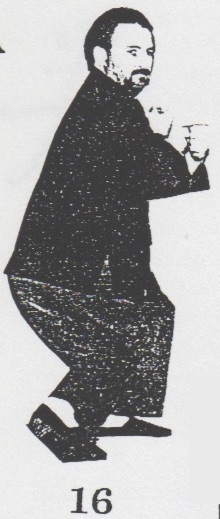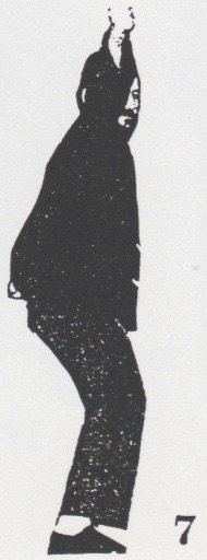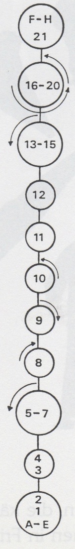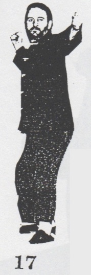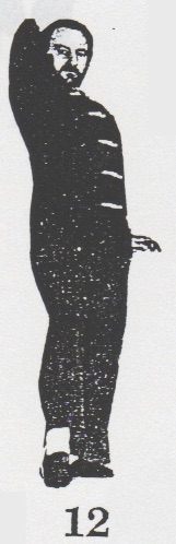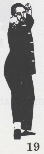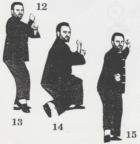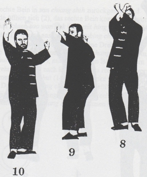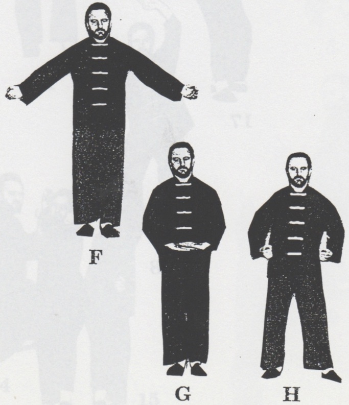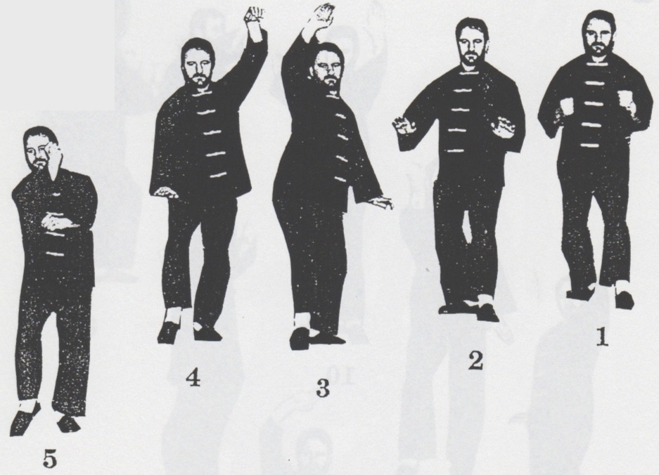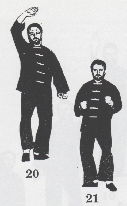 Begrüßung. Aus der Stellung ping xing ma wird das rechte Bein in san chiang shih zurückgesetzt und beide Fäuste werden geballt (1). Nun folgen sao wan gok links mit hing jarn rechts (4), 90° Drehung nach links mit gai chuen rechts (5+6) und anschließendem bing chui (7), Vierteldrehung nach rechts und go chuen sup jee gok (8). Jetzt kommt eine Drehung um 90° nach rechts mit bing chui (9), eine weitere Vierteldrehung nach links und shang jia (10). Nun mit dem linken Bein nach vorn und cua chui schlagen (11), mit dem rechten Bein nach vorn gehen und tow chow bringen (12), eine Drehung um 90° nach links (13), das rechte Bein vorn nach links übersetzen, wieder zurückkommen mit bing chui (14+15), das linke Bein wird jetzt nach hinten rechts übergesetzt, eine halbe Drehung mit bing chui links ausgeführt (16+17). Es folgt eine 90° Drehung nach links, shang jia rechts (18), ping chung chuen rechts (19), shang jia rechts (20) und anschließend die Kampfstellung san chiang shih einnehmen (21). Beenden der kuen mit dem Abschluß (F-H).