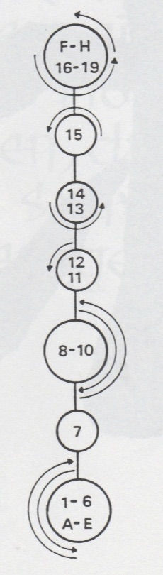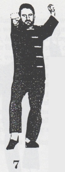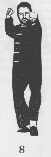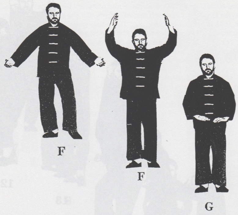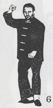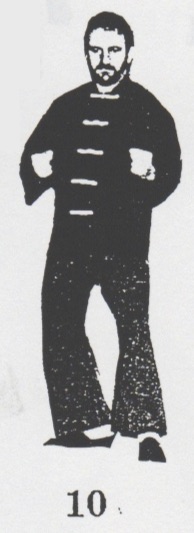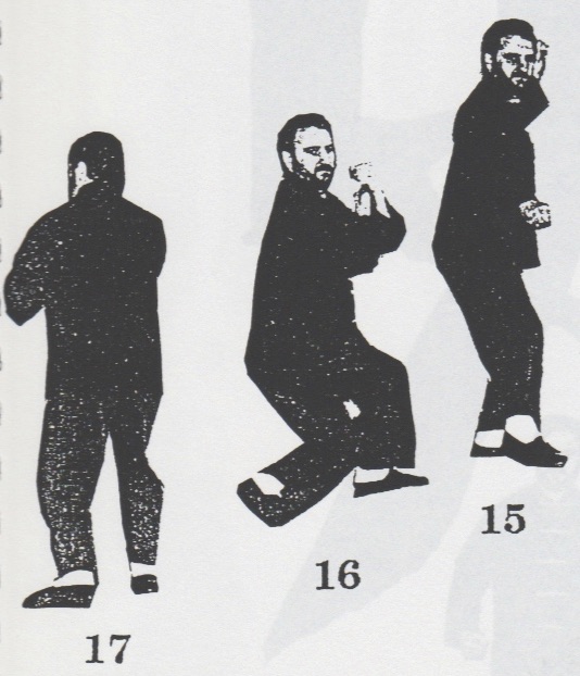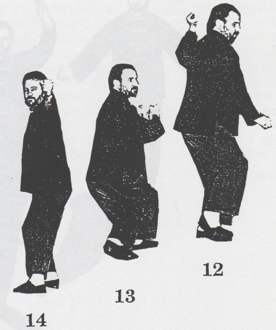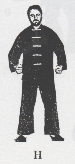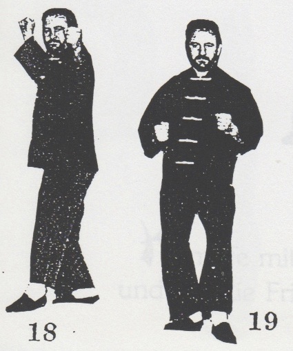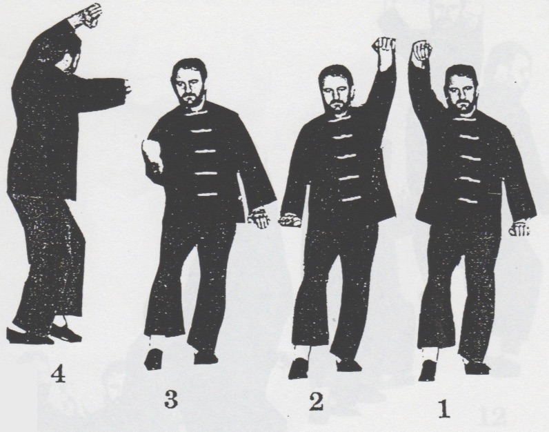Begrüßung. Aus der Stellung ping xing ma wird das rechte Bein in san chiang shih zurückgesetzt und beide Fäuste werden geballt. Nun geht man mit dem rechten Bein nach vorn, bringt mit rechts sao wan gok, hing jarn und shang chung chuen (1 -3). Nun dreht man sich um ca. 180°, wehrt mit shang jia links ab und stößt cuo ping chung chuen mit rechts (4), dreht sich wieder um 180° zurück, wehrt mit shang jia rechts ab und stößt hoc foo tau sum chui mit links (5). Das rechte Bein wird jetzt zurückgesetzt mit gleichzeitigem gai chuen links (6). Es folgen zwei Schritte, rechts und links, jeweils mit ping chung chuen (7+8) und anschließend yah chui nach hinten (9) und zurückdrehen in die Kampfstellung san chiang shih (10). Nun folgen eine Vierteldrehung nach links, gai chuen nach unten, das linke Bein wird nach hinten rechts übergesetzt, eine halbe Drehung mit bing chui links ausgeführt (11-14). Jetzt wird um 180° nach links gedreht, gai chuen nach unten geschlagen, das linke Bein wird wieder nach hinten rechts übergesetzt, eine halbe Drehung mit bing chui links ausgeführt (15-18), und die Kampfstellung san chiang shih eingenommen (19). Beenden der kuen mit dem Abschluß (F-H).